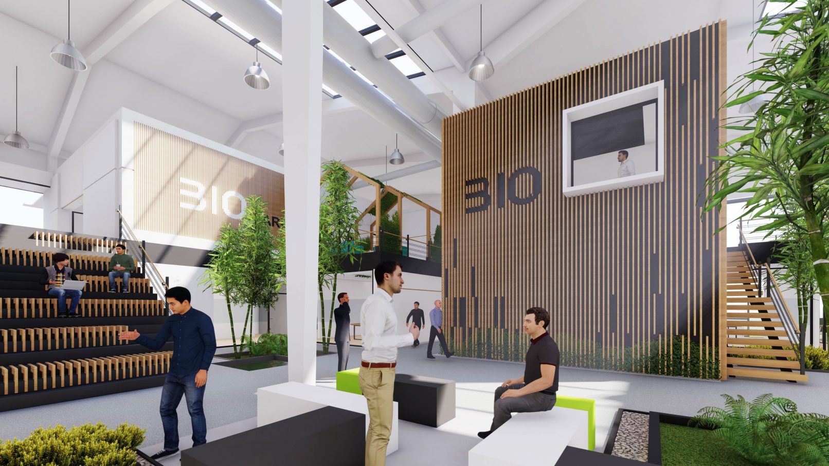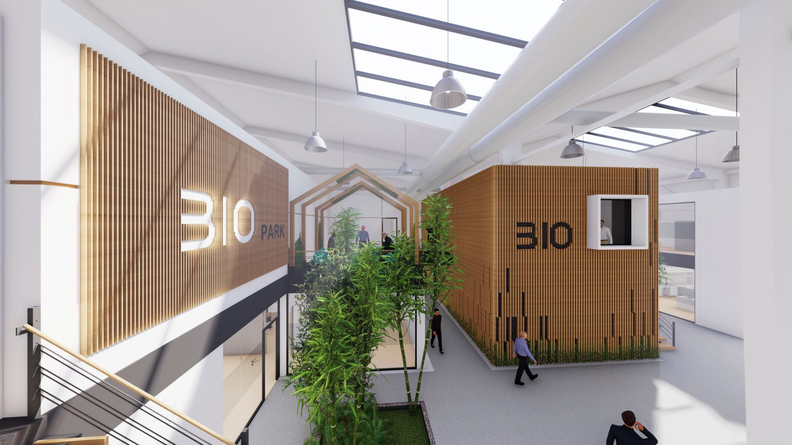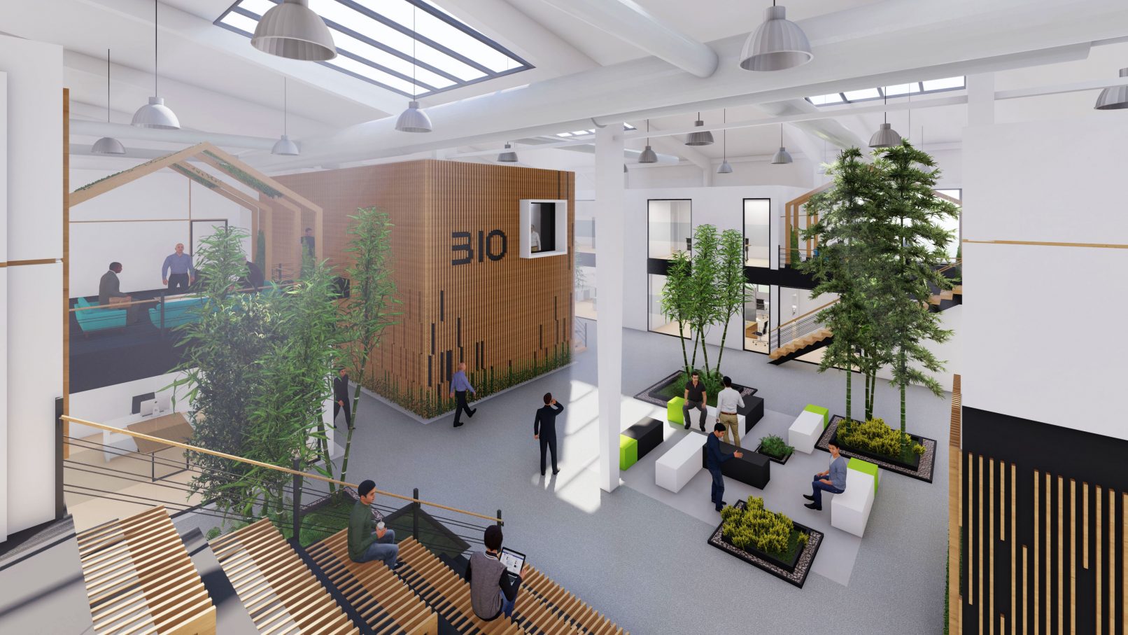 سه باغچه کوچک کناری با قرارگیری در زیر نورگیرهای سقفی تامین کننده فضاهای استراحت و مراودات اجتماعی واحدهای اداری هستند.