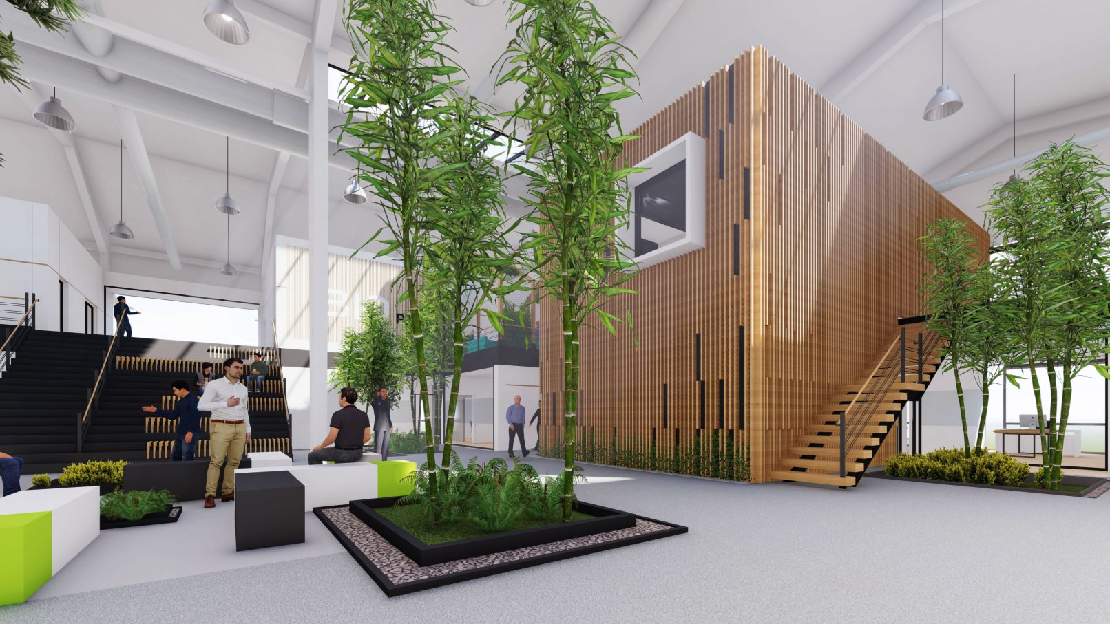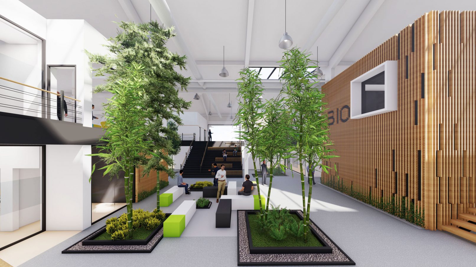 استفاده از چوب طبیعی و درختان در حیاط مرکزی در کنار جدارههای سفید فضاهای اداری در عین ایجاد تضاد؛ فضایی سرزنده و دلنشین ایجاد میکند.