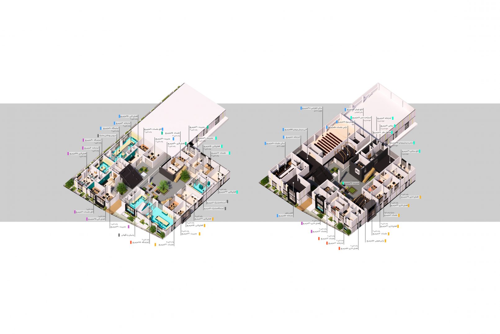 ساماندهی ده واحد اداری در متراژهای مختلف، آزمایشگاه ها و فضای ستادی در دوطبقه مرکز نوآوری به کمک فضای باز میانی اتفاق میافتد. این حیاط مرکزی در عین رویدادپذیری و ایجاد فضای شکلگیری مراسمات جمعی؛ نور طبیعی واحدهای فضاهای میانی را نیز تامین میکند.
